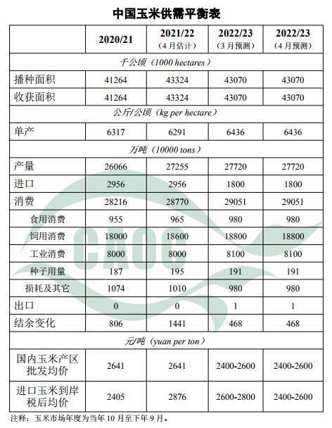 中國農(nóng)業(yè)農(nóng)村部公布農(nóng)產(chǎn)品供需形勢分析報告:本月預(yù)測,2022/23年度中國玉米生產(chǎn)、消費(fèi)、貿(mào)易和價格預(yù)測數(shù)與上月保持一致。春耕在即,玉米存儲成本增加,農(nóng)戶出售余糧意愿增強(qiáng),主產(chǎn)區(qū)各類糧食企業(yè)收購進(jìn)度較上年同期快約6%。需求方面,蛋禽、肉禽養(yǎng)殖利潤有所回升,但生豬養(yǎng)殖仍處于虧損狀態(tài),整體飼用消費(fèi)需求恢復(fù)不及預(yù)期,而玉米深加工市場維持低庫存低生產(chǎn)狀態(tài),部分工廠因虧損開啟檢修或停機(jī)后,下游需求仍舊清淡,多以消化庫存為主,疊加進(jìn)口增加、稻米拍賣入市等因素影響,預(yù)計短期內(nèi)國內(nèi)玉米價格弱勢運(yùn)行。隨著消費(fèi)持續(xù)恢復(fù),種植成本提供下方支撐,后期玉米價格將止跌企穩(wěn)。