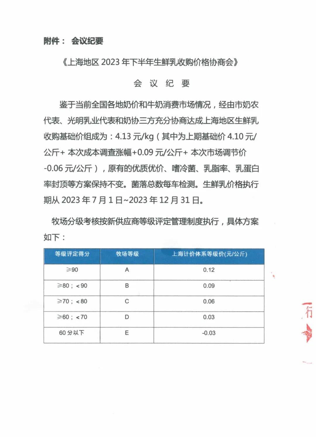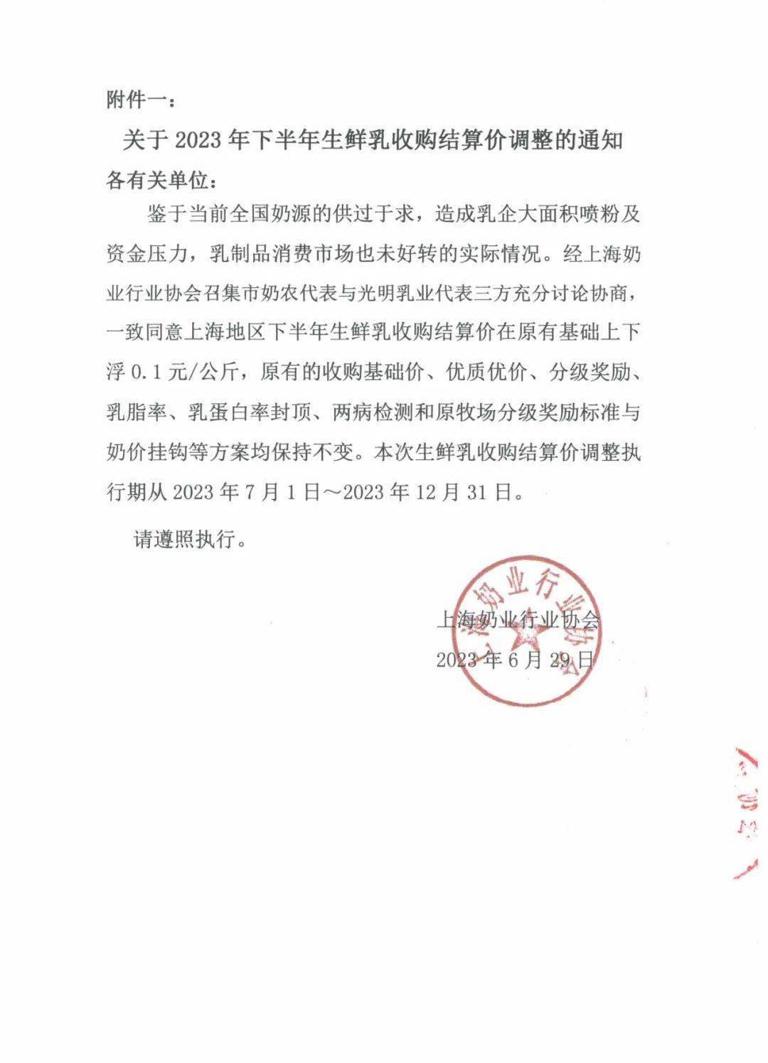 按照本市生鮮乳價格協(xié)商機制規(guī)定,經(jīng)上海奶業(yè)行業(yè)協(xié)會召集市奶農(nóng)代表與光明乳業(yè)代表三方充分討論協(xié)商,鑒于當前全國各地奶價和牛奶消費市場情況,奶農(nóng)和乳企雙方達成一致意見:2023年下半年上海地區(qū)生鮮乳收購基礎價為4.13元/公斤,原有的優(yōu)質(zhì)優(yōu)價、嗜冷菌、乳脂率、乳蛋白率封頂、兩病檢測與奶價掛鉤等方案保持不變。菌落總數(shù)每車次檢測。生鮮乳價格執(zhí)行期從2023年7月1日~2023年12月31日。