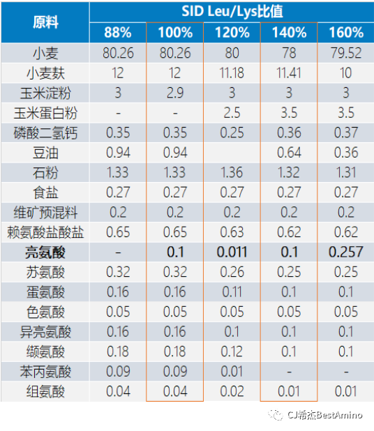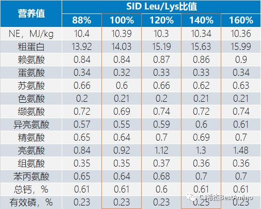 3.日糧亮氨酸過高(SID Leu/Lys比值140%)時,需要注意平衡異亮氨酸、纈氨酸、色氨酸和賴氨酸水平。