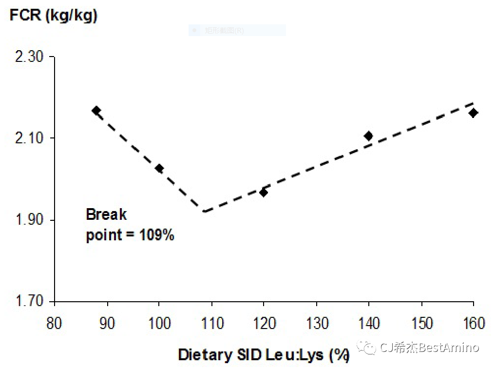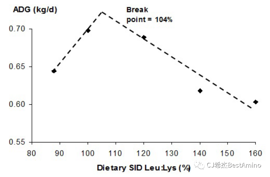 1.日糧亮氨酸與賴氨酸比值生長豬生長性能(ADG和FCR),以ADG和FCR為指標,最佳日糧SID Leu/Lys比值分別為104%和109%。
