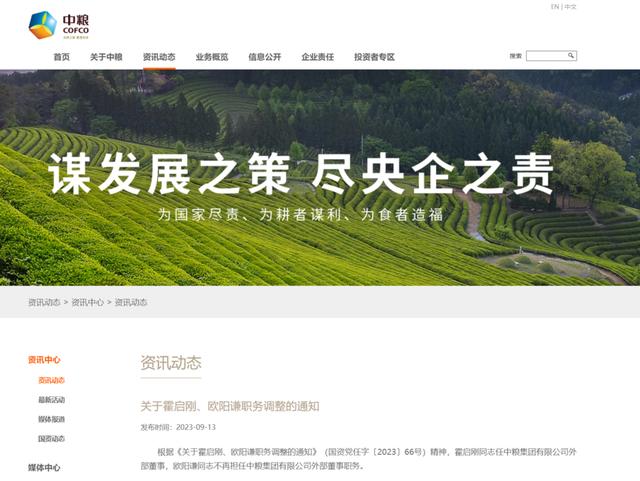 據(jù)中糧集團(tuán)官網(wǎng)9月13日消息,根據(jù)《關(guān)于霍啟剛、歐陽(yáng)謙職務(wù)調(diào)整的通知》(國(guó)資黨任字〔2023〕66號(hào))精神,霍啟剛同志任中糧集團(tuán)有限公司外部董事,歐陽(yáng)謙同志不再擔(dān)任中糧集團(tuán)有限公司外部董事職務(wù)。