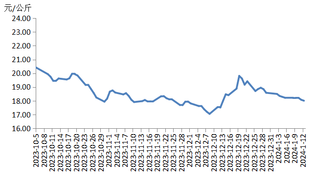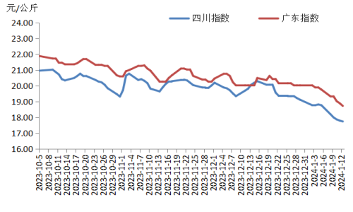 本周,四川豬肉周均價為每公斤17.93元,環(huán)比下跌4.6%,同比下跌10.5%,較上周跌幅持平。本地散養(yǎng)戶出欄積極,批發(fā)市場到貨量較充沛,小規(guī)格白條豬肉(胴體體重80公斤以下)仍有供應,致使市場上生豬及豬肉總體供應充足;腌臘、灌香腸活動接近尾聲,消費者對高價豬肉的接受能力較弱,豬肉價格下跌。