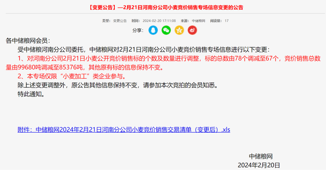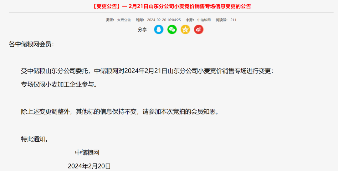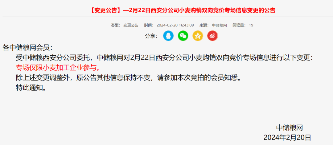 2月20日,中儲(chǔ)糧網(wǎng)發(fā)布最新消息,中儲(chǔ)糧河南分公司2月21日小麥銷售專場(chǎng)、山東分公司2月21日小麥銷售專場(chǎng)、2月22日西安分公司購(gòu)銷雙向?qū)?chǎng)、2月22日北京分公司購(gòu)銷雙向?qū)?chǎng)、2月22日湖北分公司購(gòu)銷雙向?qū)?chǎng)都陸續(xù)進(jìn)行變更:僅限小麥加工企業(yè)參與。
