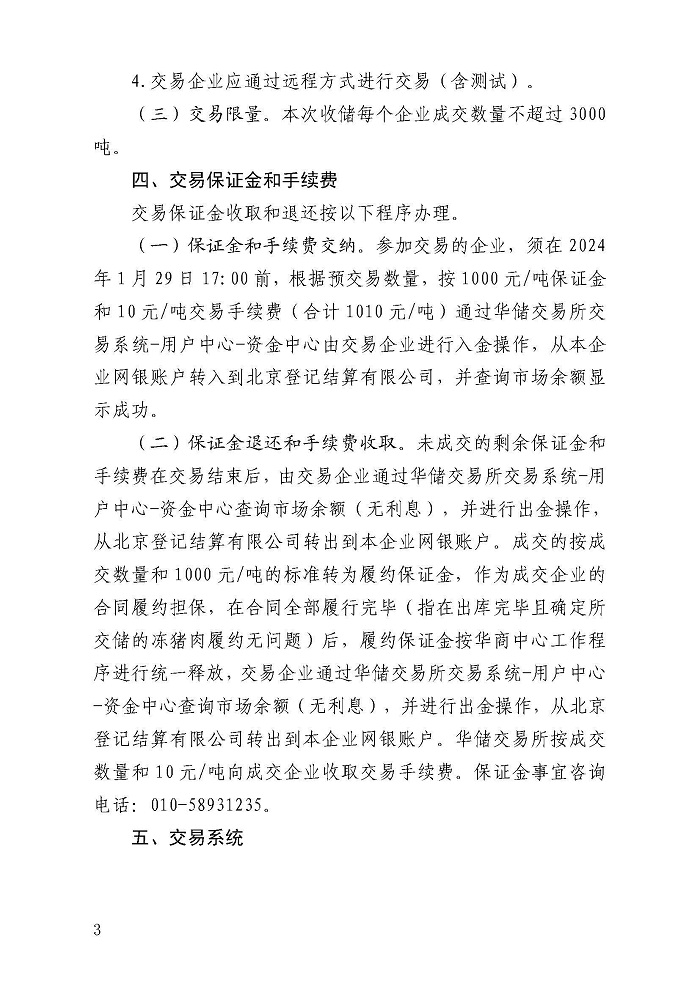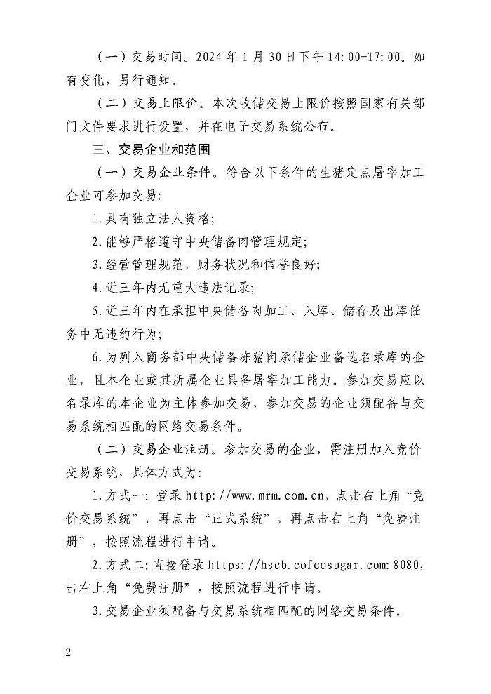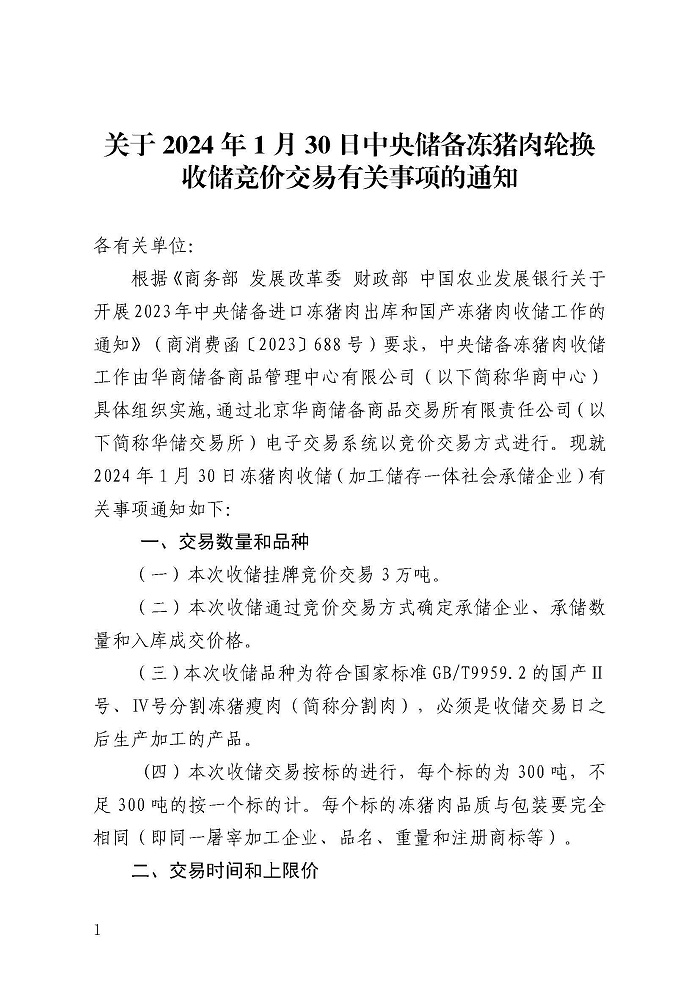 華儲(chǔ)網(wǎng)2月27日發(fā)布關(guān)于2024年2月28日和29日中央儲(chǔ)備凍豬肉輪換收儲(chǔ)競(jìng)價(jià)交易有關(guān)事項(xiàng)的通知。本次收儲(chǔ)掛牌競(jìng)價(jià)交易3.31萬噸,交易時(shí)間為2024年2月28日下午13:30-16:30。如果2024年2月28日下午有未成交的標(biāo)的,則在2月29日下午13:30-16:30對(duì)未成交的標(biāo)的重新掛牌收儲(chǔ)交易。