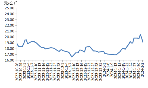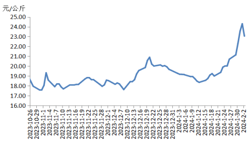 本周華東地區(qū)豬肉價格環(huán)比大幅上漲,周內先漲后跌。規(guī)模養(yǎng)殖場和散養(yǎng)戶出欄生豬的數量減少,屠宰企業(yè)收購生豬的成本上漲;周內恰逢小年集中備貨,豬肉訂單量明顯增多,銷售速度加快,供減需增支撐價格大幅上漲。僅在周末時,隨小年備貨結束,豬肉消費短時回落,價格下跌。