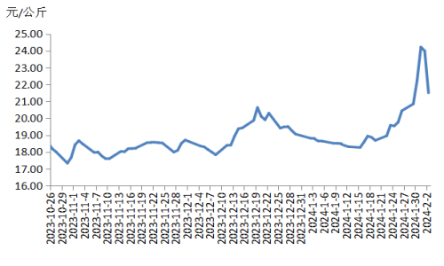 本周國內瘦肉型白條豬肉出廠價格(以下簡稱“豬肉價格”)環(huán)比大幅上漲,主要是因為局部地區(qū)雨雪天氣不利于生豬出欄,加之部分散養(yǎng)戶存壓欄惜售,致使生豬及豬肉供應短時收緊。同時,隨小年、春節(jié)等節(jié)慶臨近,終端需求提升,部分豬肉貿易商看漲年前行情而提高拿貨積極性,促使白條豬肉銷售速度加快,價格大幅上漲,僅周末時因小年備貨期結束,消費者對高價貨源的采購能力有所減弱,豬肉價格小幅回落。