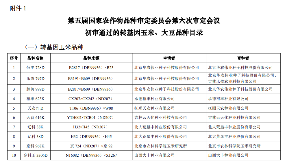 3月19日,農(nóng)業(yè)農(nóng)村部官網(wǎng)發(fā)布關(guān)于第五屆國家農(nóng)作物品種審定委員會第六次審定會議初審?fù)ㄟ^品種的公示。其中,27個轉(zhuǎn)基因玉米和3個轉(zhuǎn)基因大豆品種通過初審,涉及大北農(nóng)、隆平高科、登海種業(yè)、豐樂種業(yè)等多家上市公司,其中有16個轉(zhuǎn)基因品種的轉(zhuǎn)化體所有者為大北農(nóng)。
