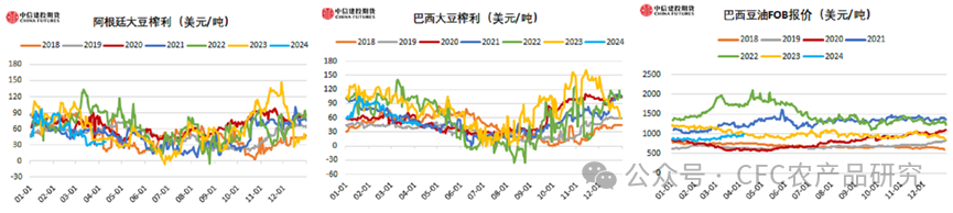 2.美豆油(7728, 34.00, 0.44%)價(jià)格強(qiáng)勢(shì),支撐巴西國內(nèi)大豆(4794, 8.00, 0.17%)榨利,進(jìn)而形成了巴西內(nèi)陸大豆壓榨廠收購價(jià)格高于出口商給出的內(nèi)陸收購價(jià),因此賣壓并未壓低CNF價(jià)格。