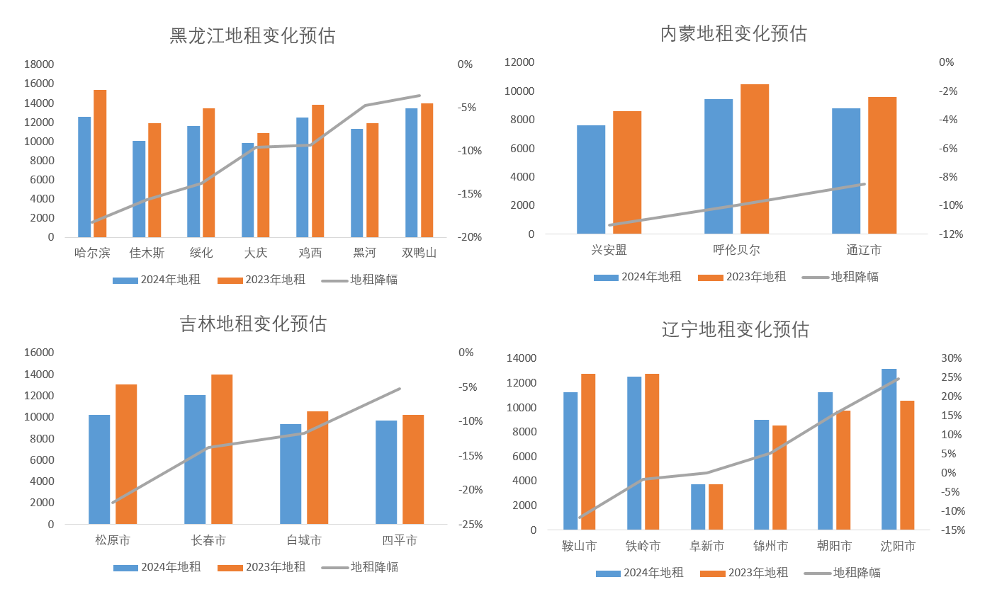 內(nèi)蒙古東部樣本點(diǎn)地租下降8-10%,其中興安盟下降11%,呼倫貝爾下降10%,通遼下降8%。遼寧是東北地區(qū)玉米面積比重最小的省份,局部地區(qū)雜糧、水稻種植收益顯著好于玉米,遼北地租小幅下降,遼中地區(qū)小幅上漲。