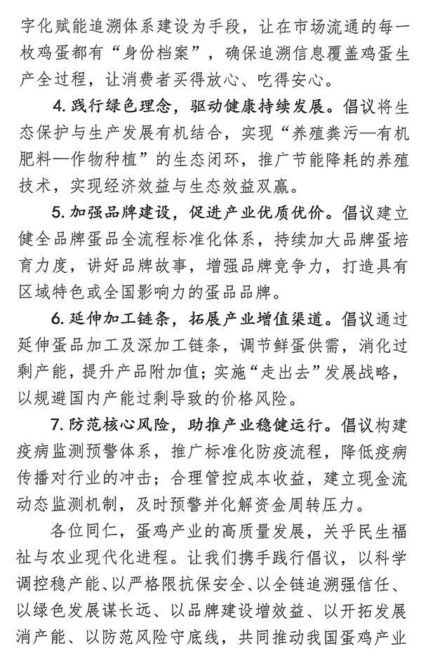 2025年10月11日,中國畜牧業(yè)協(xié)會組織召開“蛋雞產(chǎn)業(yè)高質(zhì)量發(fā)展座談會”,我國20多家重點蛋種雞、商品蛋雞、品牌蛋、蛋品加工等領(lǐng)域的企業(yè)主要負(fù)責(zé)人到會交流。會議期間,形成《關(guān)于促進我國蛋雞產(chǎn)業(yè)高質(zhì)量發(fā)展的倡議書》倡議書得到了國家蛋雞產(chǎn)業(yè)技術(shù)體系、15家省級行業(yè)協(xié)會以及37家蛋雞養(yǎng)殖企業(yè)的聯(lián)合發(fā)起。