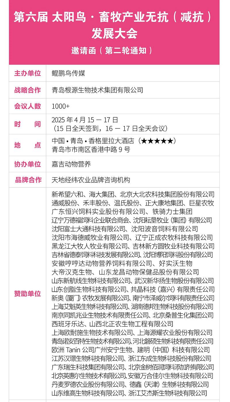 第六屆 太陽鳥·畜牧產(chǎn)業(yè)無抗(減抗)發(fā)展大會(第二輪通知)