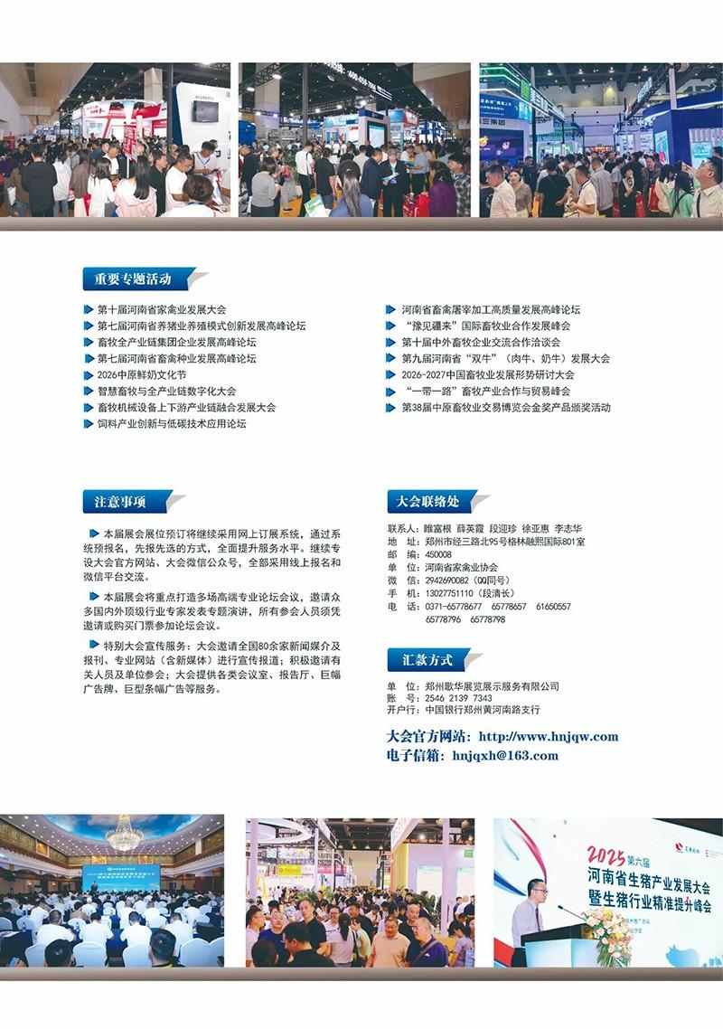 中原畜牧業(yè)交易博覽會(huì)(河南家禽交易會(huì))經(jīng)過37年的改革與發(fā)展,目前已成為檔次高、規(guī)模大、影響力強(qiáng)、展會(huì)品牌響亮、活動(dòng)內(nèi)容豐富、參觀人員眾多的畜牧業(yè)盛會(huì),也是國內(nèi)外涉牧企業(yè)進(jìn)軍中原畜牧市場的重要平臺(tái)。2025年第37屆中原畜牧業(yè)交易博覽會(huì)在鄭州成功舉辦,有來自全國的參展企業(yè)400多家,參會(huì)人數(shù)8萬多人,室內(nèi)外展覽面積近5萬平方米,設(shè)置招商引資、高峰論壇、專題技術(shù)講座、專題學(xué)術(shù)報(bào)告及論壇活動(dòng)等。