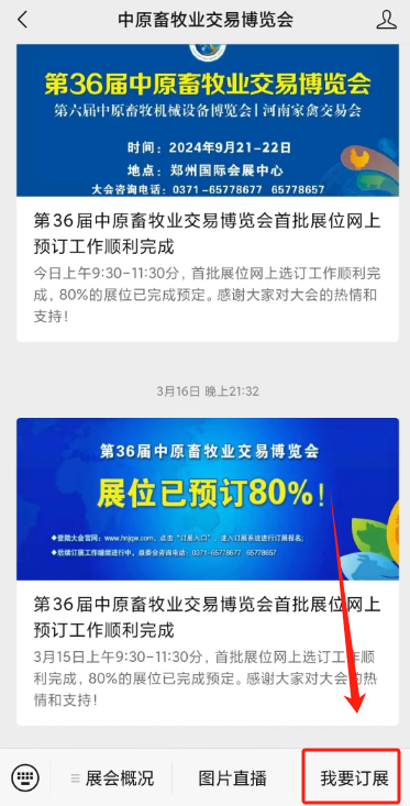 第36屆中原畜牧業(yè)交易博覽會(河南家禽交易會)將于2024年09月21-22日在鄭州國際會展中心隆重舉辦,組委會各項(xiàng)工作已全面開展,展位預(yù)定持續(xù)進(jìn)行中,可至大會官網(wǎng)www.hnjqw.com (訂展入口)或大會微信公眾號點(diǎn)擊“我要訂展”,也可微信搜索“中原畜牧業(yè)交易博覽會訂展系統(tǒng)”進(jìn)入小程序預(yù)訂展位,小程序與網(wǎng)站版訂展系統(tǒng)數(shù)據(jù)完全同步,如已有賬號可直接登錄,無需重新注冊。